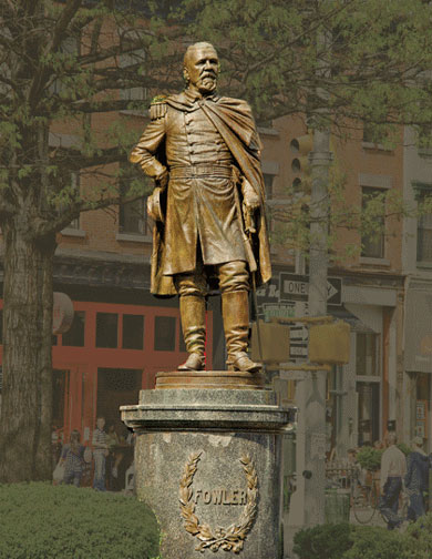 The statue of General Fowler in front of the Smoke Joint on South Elliott Place. |